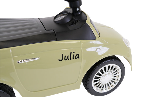 De Fiat 500 als loopauto! Bandits & Angels heeft deze retro groene variant, geschikt voor kids vanaf 1 jaar. De zitting heeft een hoogte van 25 cm, eronder is opbergruimte te vinden. Op het werkende stuur zit een werkende claxon. De rugleuning kan ook als duwstang gebruikt worden. De vier wielen maken de loopauto stabiel, samen met het anti kantelblok aan de achterzijde. Optioneel: bestel een stickerset met eigen naam mee.